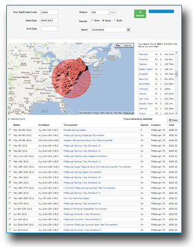 Welcome to the New "Tournamnets and Event Locator Map" created for your convinience. This feature will allow you to set a radius from a central location and list all the events within that radius graphicaly on a map. This feature will allow you to filter events based on date (start and end), Gender and sport. Only the sports that we have registered events for are presented in the "sport" drop down. Many travel teams or programs are geared to travel a certain distance from their base of operations. This tool will assist you in setting that limit. Setting the date range and other filters will help you minimize all the chatter and background noise of events that are outside your range and you would not be traveling too. A perfect example of this if you were a travel program in New York City. New York is a large state. On most listing services you select New York and you get events in Syracuse, Albany, Buffalo and other towns. If you are located in NY City chances are you will not be driving 400 miles to an event in Buffalo and vice versa. |