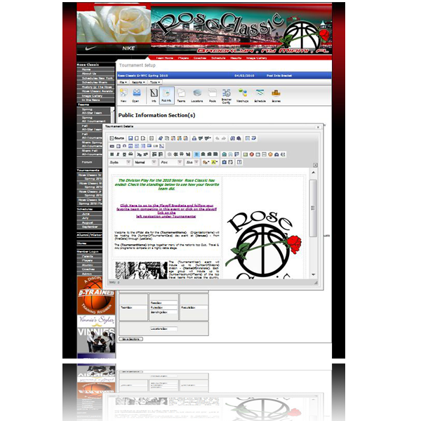 Your Tournament Home Page is auto generated and allows you to easily edit the information or add additional information. Participating Teams / Schedules and Directions / Game Results are all presented on the Tournament Home Page.
